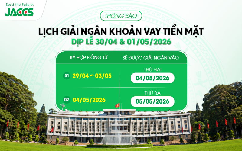 Nhằm đảm bảo kế hoạch tài chính của Quý khách được duy trì liên tục trong thời gian nghỉ lễ, Công ty Tài chính TNHH Một Thành Viên Quốc Tế Việt Nam JACCS (JIVF) trân trọng thông báo lịch giải ngân các khoản vay tiền mặt như sau: